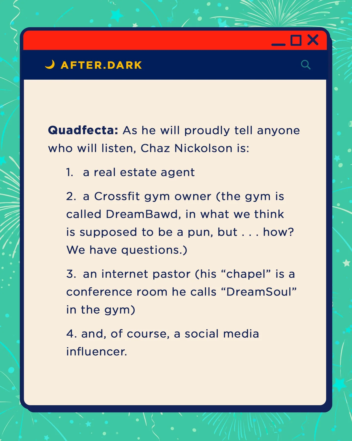 2) a Crossfit gym owner (it’s called DreamBawd in what we think is supposed to be a pun, but…how? Is the gym itself bawdy? The bodies bawdy? The mystery remains), which he runs with his best friend/partner in crime, Grant Ford (the LeFou to Chaz’s Gaston).