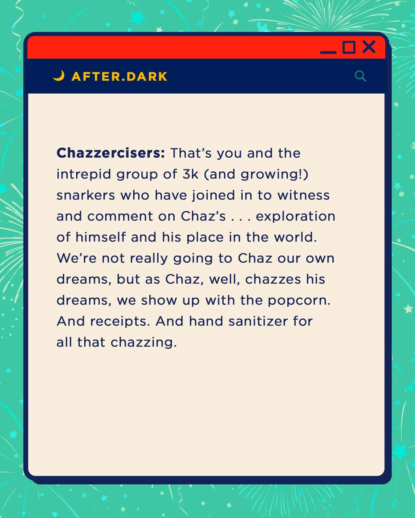 Chazzercisers: That’s you and the intrepid group of 17k (and growing!) snarkers who have joined in to witness and comment on Chaz’s…exploration of himself and his place in the world. We’re not really going to Chaz our own dreams, but as Chaz, well, chazzes his dreams, we show up with the popcorn. And receipts. And hand sanitizer for all that chazzing.
