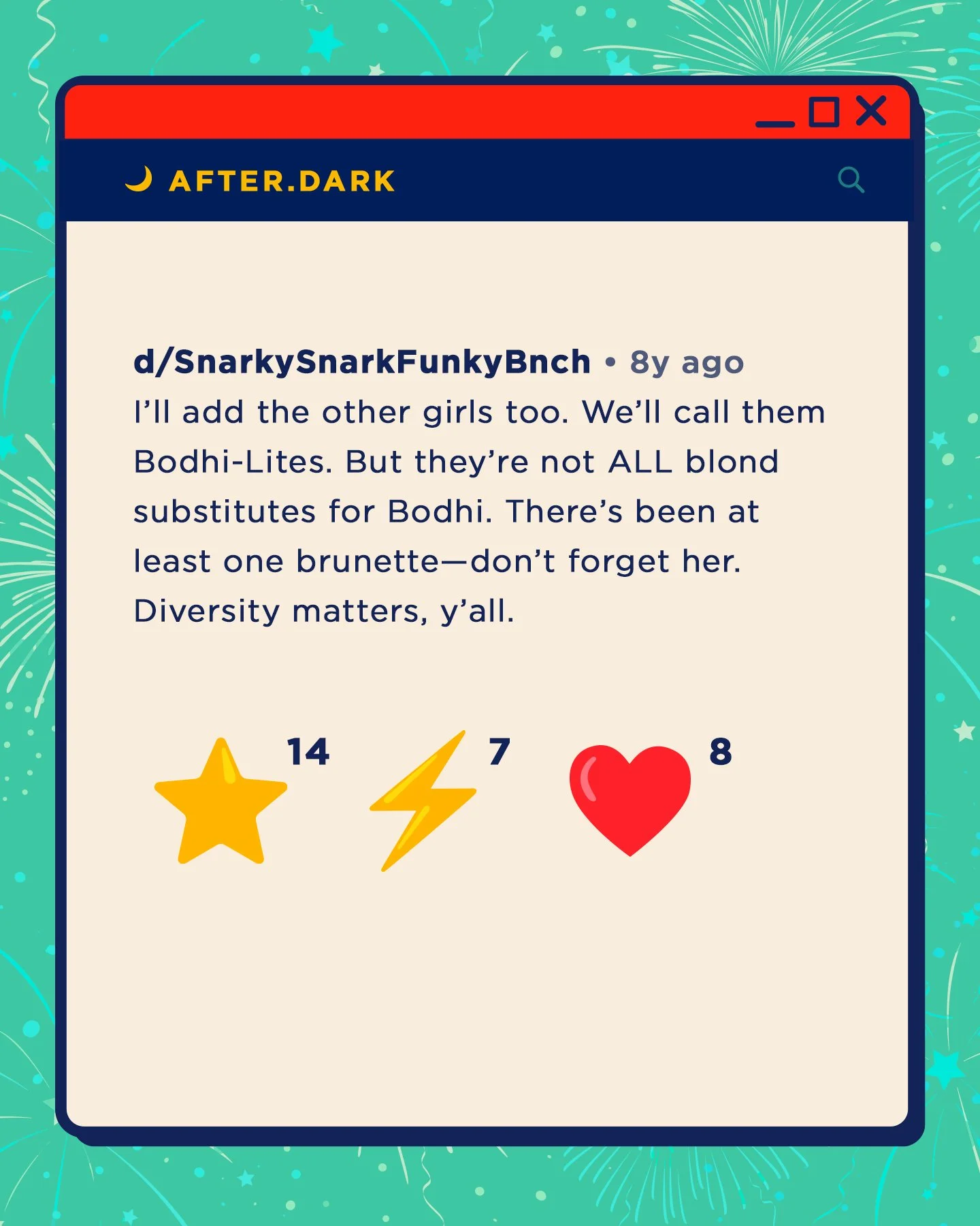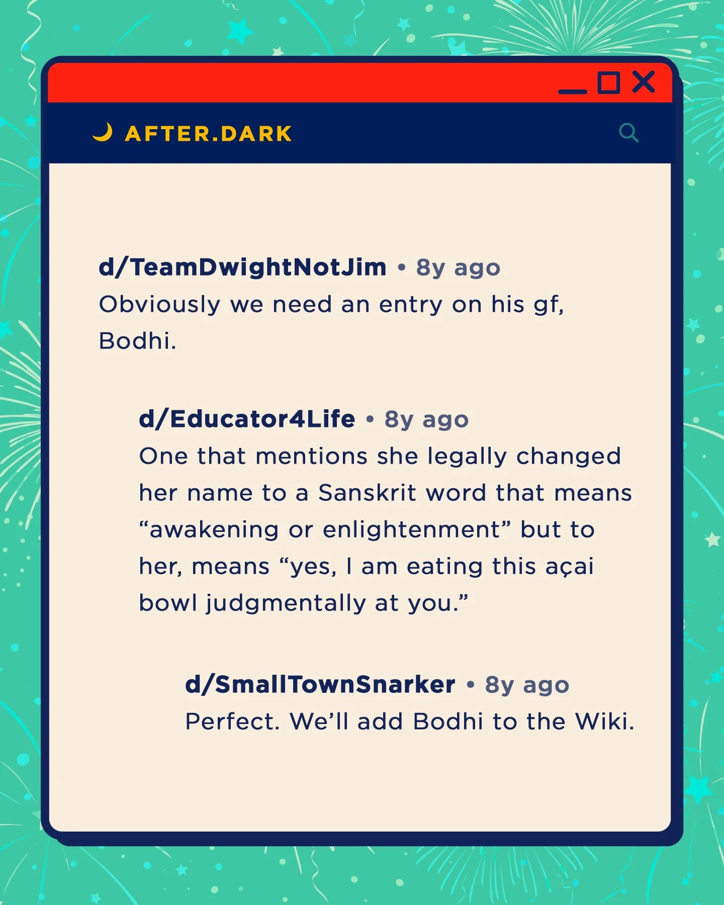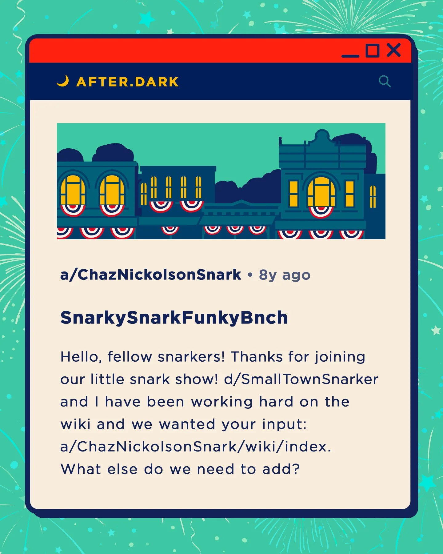 Below, you’ll see how the snark wiki began (using “After Dark” so we don’t get sued by the actual community home), and the archived wiki itself.