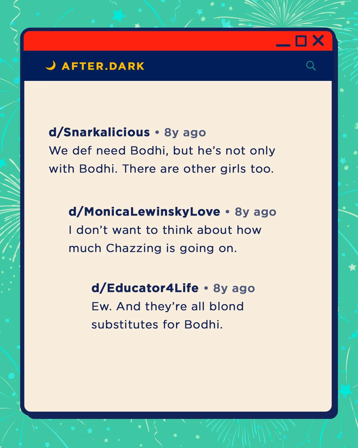 Bodhi-Lites: Our own u/MonicaLewinskyLove coined this term for the interchangeably blonde, fit, and young honeys Chaz hooked up with after Barista-gate. Some were bougie woo-woo, others were more hard-core-fitness, but they all had one thing in common: growing social media followings. They hitched their star to Chaz, or he hitched his star to them, or they all…well, no one actually got hitched but there was a lot of hooking up and taking selfies, ostensibly to get more famous. Those were dark years in Chaz’s life as he…found himself. Or found something, at least.