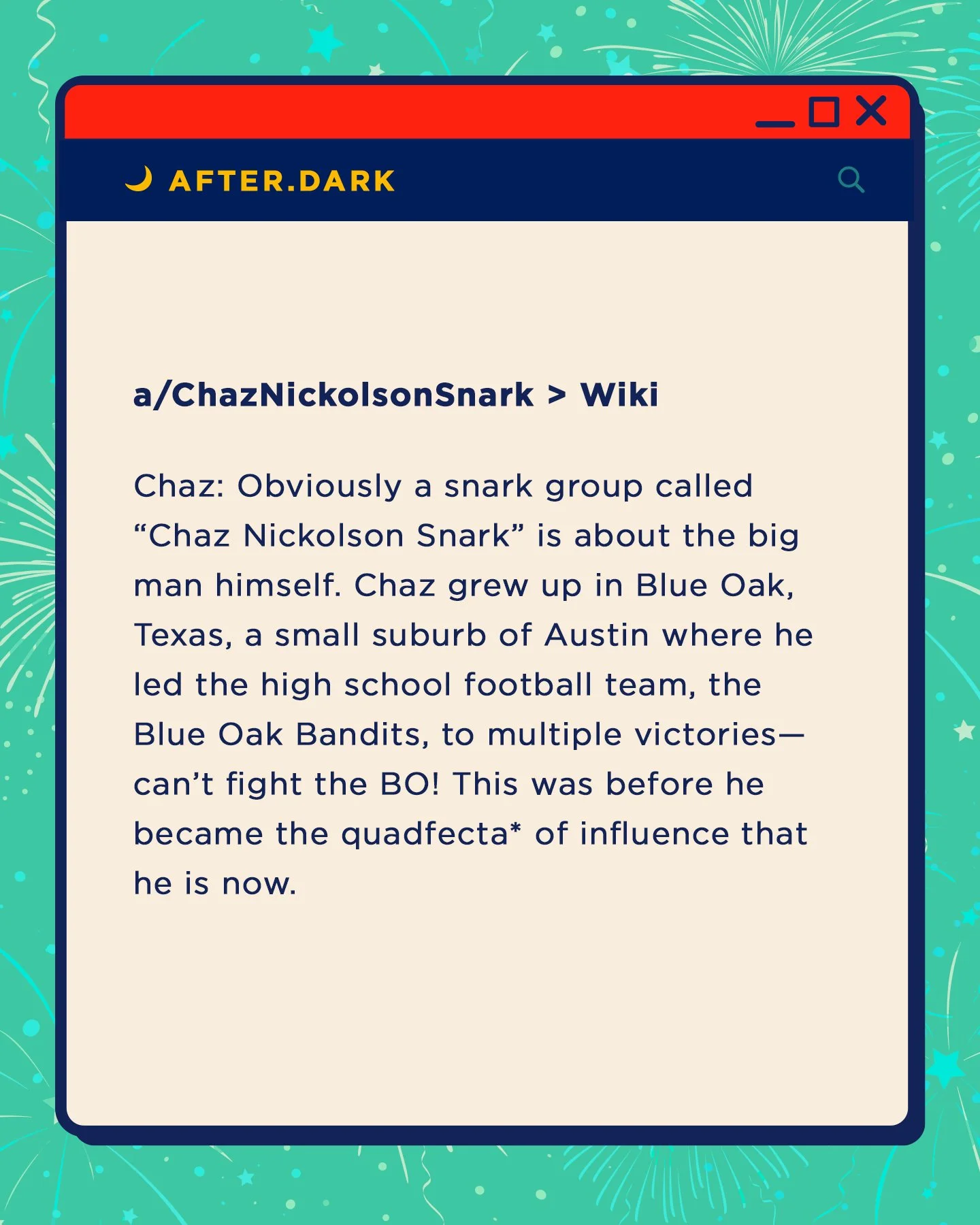 RIP, r/ChazNickolsonSnark. You were our home on the internet for many years, and we’ll always treasure the community we made there. I hope you all keep Chazzing Your Dreams. I know I will.